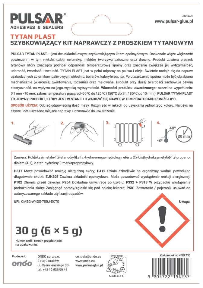 PULSAR TYTANPLAST to dwuskładnikowa żywica epoksydowa w formie plasteliny, wzmocniona proszkiem tytanowym, która pozwala szybko i trwale naprawiać pęknięcia, ubytki oraz nieszczelności - nawet w wilgoci, niskiej temperaturze i trudnych warunkach pracy. Po utwardzeniu tworzy bardzo mocną, szczelną i obrabialną spoinę.