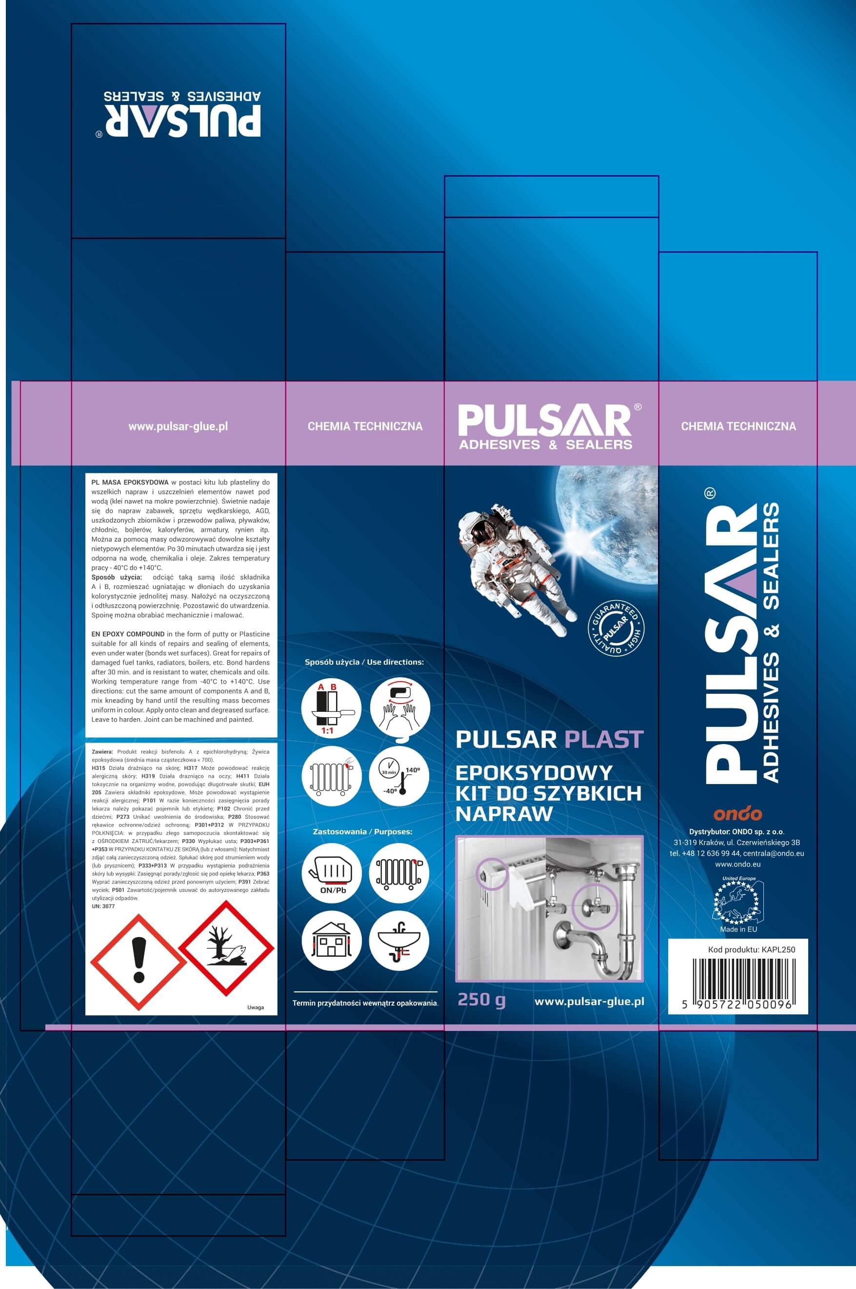 PULSAR PLAST to dwuskładnikowy klej epoksydowy i kit naprawczy, który pozwala Ci wykonać trwałe, odporne naprawy w warsztacie, domu i przemyśle. Działa jak mocne spoiwo i wypełniacz ubytków - przywracasz sprawność zamiast wymieniać części.