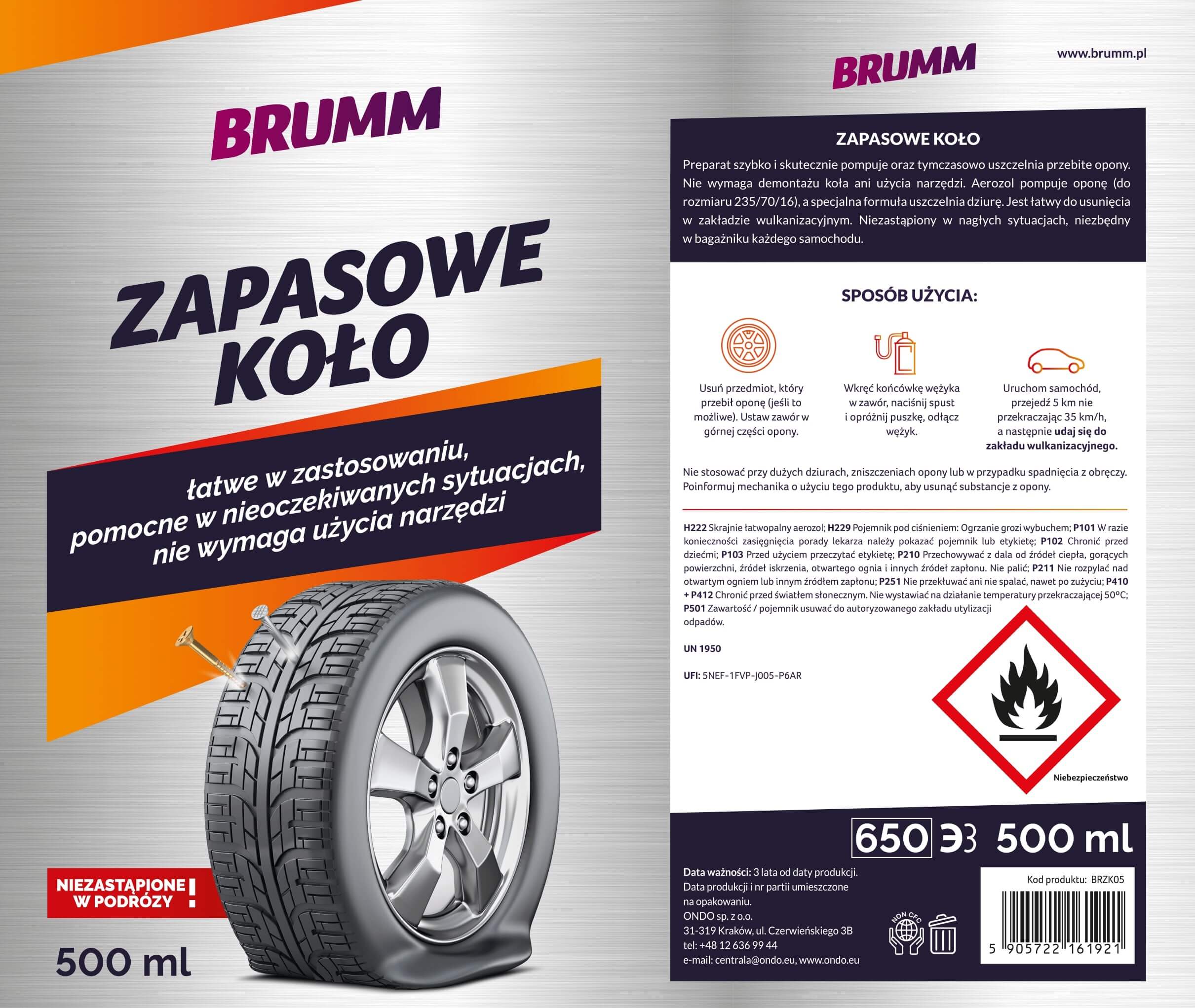 KOŁO ZAPASOWE USZCZELNIACZ DO OPON W SPRAYU BRUMM ŁATWE ZASTOSOWANIE 500 ml